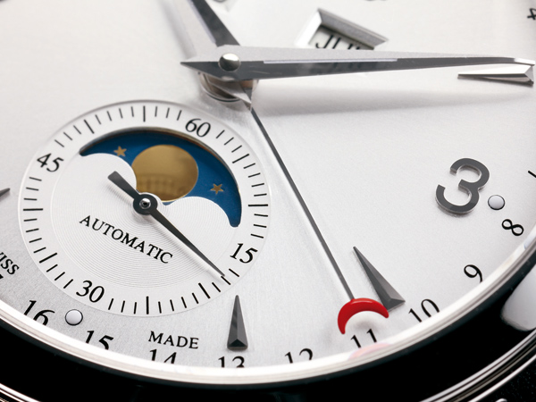 本錶款的面盤樣貌,接近昔日Master Moon的排列設計,星期與月份視窗都位於十二點鐘位置的下方,不過視窗內的字體皆為黑色,與先前Master Moon所使用的紅色不同。由中央延伸出的日期指針,前端的紅色新月圖案,一直以來都是本系列腕錶的經典象徵,透過搭配面盤外圍的日期數字,具有濃厚的復古風格。而六點鐘位置的月相盈虧視窗,中央則有秒針設計,周圍的60秒刻度,則是與Master Moon最大不同之處。