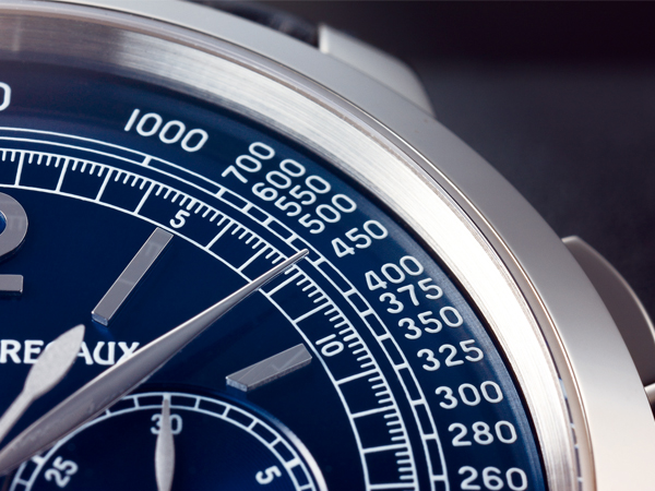 而錶款的面盤外圍具有測速計,可計算物體在一公里距離內,所移動的平均速度。而細膩劃分的測速計數字,讓使用者能更快速獲得計算的數據,從700至130公里採用少見的垂直排列方式,不僅容納更多數字,也使錶款更具有古典風貌。
