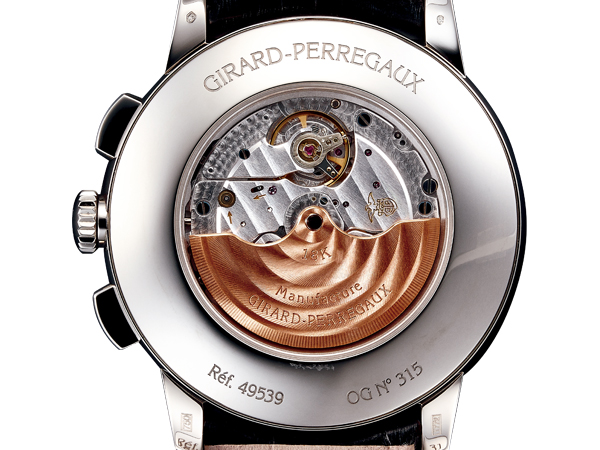 位於面盤九點鐘位置的是恆動小秒針,而三點鐘位置的則是30分鐘計分盤,透過兩者之間的對稱設計,讓面盤的視覺效果更為卓越。錶殼內部所搭載的計時機芯,是芝柏表自行研發的GP 030C0自動機芯,它是以GP 3200自動機芯為基礎,然後在機芯上方(在面盤後方)加裝導柱輪計時結構。