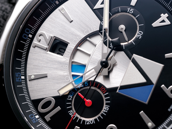 中央計時碼錶,三點位置小秒針,九點鐘位置為三十分鐘計時盤,前十分鐘的藍紅配色時標,是針對帆船賽的特殊規則所設計。提示配戴者距離比賽正式起跑的時間。配色主要對應到中央時、分針上方的五格小窗,這是錶款主要特色,能夠進行十分鐘的倒數計時。隨著倒數,格內的時間會由白轉藍,最後轉紅,表示倒數計時結束。