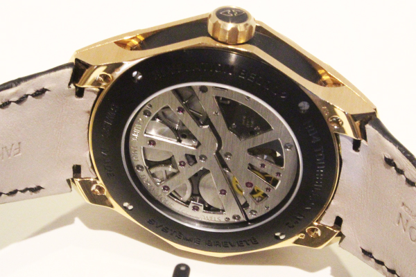 兩片玻璃錶面不滿約70億分之一米,無法被肉眼所見的直線紋路。單看之下並無異樣,但當兩片玻璃交疊,佈滿其上的奈米紋路便會因為偏光阻絕光線,令視線無法穿透錶鏡,製造出不透明面盤感覺。反之,則又變回透明面。