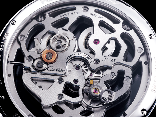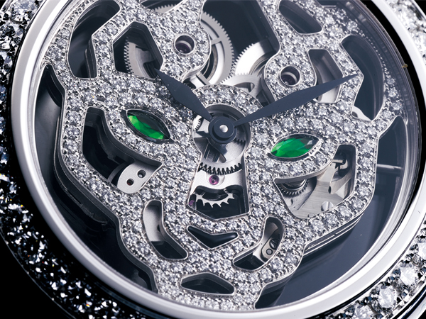 一只鏤空錶款的困難度,除了在於其優美的通透的視覺外,同時還要兼顧機芯本身的強度。而卡地亞則以獨到的美學觀點,將機芯巧妙的雕琢成美洲豹頭像圖案,每個描繪輪廓的線條,都是承載機芯齒輪結構的必要支撐。說明品牌高段的設計與製作工藝。