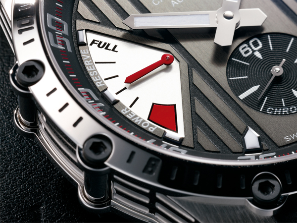 6點鐘方向的小秒盤靈感則取轉速表,9點鐘位置的動力儲存則仿造油箱顯示,看著手腕上的腕錶,卻感覺看著汽車儀表板,相當真實。除此之外,錶耳周圍與錶殼雙側的製作相當費工,先切割出線條凹槽,再拋光、以霧面效果呈現。