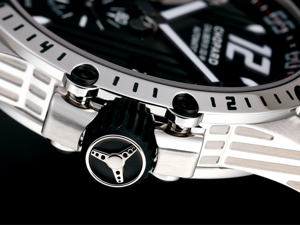蕭邦對古董車的熱愛不言而喻,多次擔任官方計時夥伴,為此也推出3款不同功能的紀念腕錶,來彰顯對於賽事的重視,每個部件與結構設計都是參考古董車的特色而來。本款是Superfast Power Control動力儲存腕錶,特別以45mm大尺寸呈現,錶圈以8個六角螺絲裝飾,靈感來自跑車擋泥板專用的特殊螺絲,面