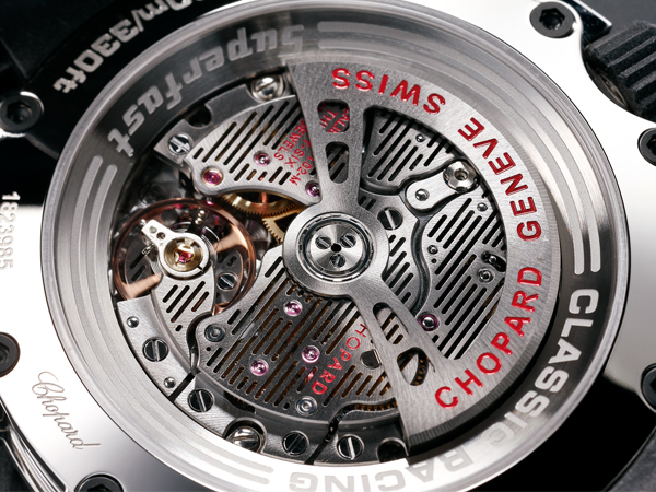 錶款外觀設計重現出古董跑車的特色,搭載蕭邦自製自動上鍊機芯,動力儲存達60小時,通過C.O.S.C瑞士天文台認證,透過透明底蓋能見到機板上都做了類似散熱片的設計,以雷射方式切割,做工繁複不易,自動盤同樣也是大幅度鏤空,雖沒有特殊複雜的功能,但外觀設計相當用心。