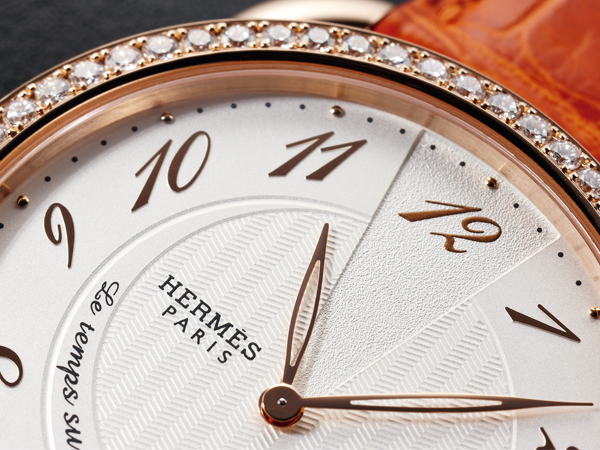 錶圈鑲上一圈美鑽,美鑽與面盤的比例均衡,有著愛馬仕一貫的美感,不像無鑽不歡的珠寶品牌,鑽石比較像用來嚇人的裝飾。面盤內圈有機刻飾紋,讓時分針暫停的區域與逆行24秒的小秒針是視覺焦點,精細而天衣無縫的製作品質十分令人動心。