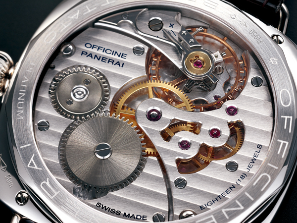 錶殼內部所搭載的OPXXVII手動上鍊機芯,是以MINERVA機芯廠的Calibre 16-17機芯為基礎所修改而成,之前也曾多次出現在沛納海的特殊限量錶款之中。這枚OPXXVII機芯的走時輪系夾板採用半鏤空設計,因此可清楚的窺見輪系的運作,夾板的表面施以細膩的日內瓦波紋處理。旋開球形錶冠,實際手動上鍊時,可以發覺上鍊的過程十分順暢,並且帶有些許回彈的力量,保有傳統手動上鍊機芯的旋轉觸感。