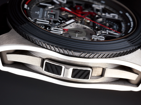 本款腕錶採用新型合金TiVan 15來製作錶殼,這是由鈦與釩兩種金屬所組成的特殊合金,它的抗刮能力比傳統的鈦合金高15%,因此可減少以往鈦金屬表面容易產生小細紋的缺點。而錶殼的表面採用霧面拉絲處理,側面的結構曲線,宛如鋼骨架構,更增添設計美學。此外,錶圈則是採用黑色陶瓷製作,藉由高硬度與抗磨損的陶瓷材質,減少錶款損傷的機會。