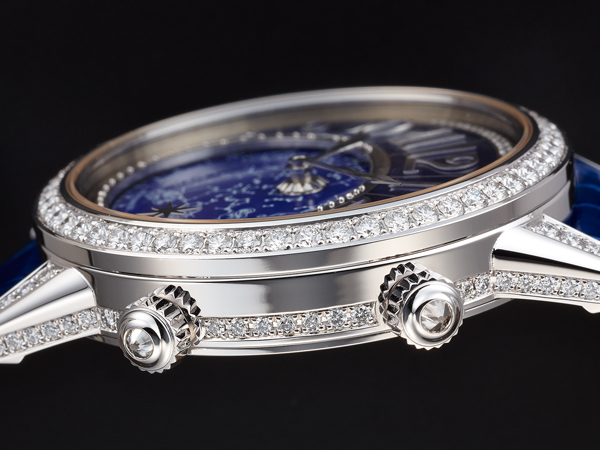 由於前幾年積家推出多款大複雜功能腕錶時,便多次採用星象功能,因此可說是駕輕就熟。不過要在面積較小的女錶上,使用大面積的星空顯示盤,則需要考慮到整體美感與機芯設計兩個層面。而本款星空腕錶,捨棄了將星象盤放置在底蓋的設計,因為錶款並不像之前的大複雜功能錶款,具有多項複雜功能,因此,將星象盤放置在正面,最符合錶款的設計美感。