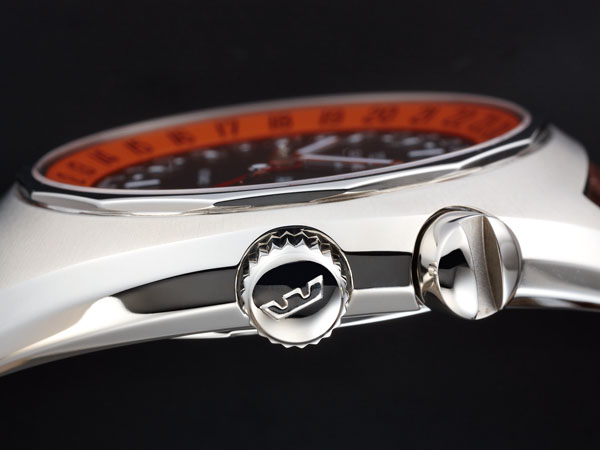 原本用來設定第二地時間的內旋轉錶圈,就可以設定為第三地的時間,是目前比較少見的三地時間腕錶。不過用來旋轉內錶圈的兩點鐘位置錶冠,為何看起來如此光滑,要如何操作呢?其實非常簡單,只需用硬幣插入錶冠頂端的凹槽,便可輕易轉動,如果指甲夠長,其實也能直接旋轉;廠方透過這樣的設計,主要是避免使用者誤觸錶冠。