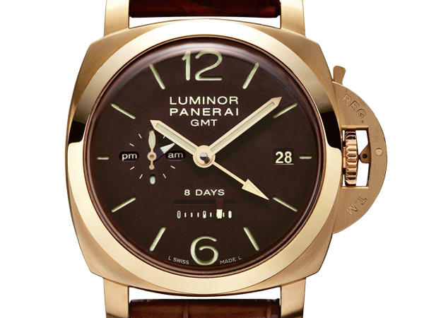 一般沛迷多偏好不鏽鋼殼,其實從品牌名稱就能看出端倪:OFFICINEPANERAI的Officine語意是製造、工作的意思,顯然它強調功能性比強調貴金屬更適切。只是,僅僅是功能性不能一網打盡所有錶迷,編號PAM289的Luminor1950 8 Days GMT就採用沛納海較罕見的玫瑰金殼。