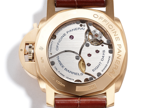 2005年,沛納海推出品牌首枚自製機芯P.2002,是枚擁有8日長儲能、且有GMT功能的手上鍊機芯。它採用三發條盒蓄積動能,其中兩枚串疊,與第三枚連結,再帶動走時輪系,也另外透過複雜的中間輪帶動直線儲能指示,光是這點,多少死忠沛迷拜倒裙下。