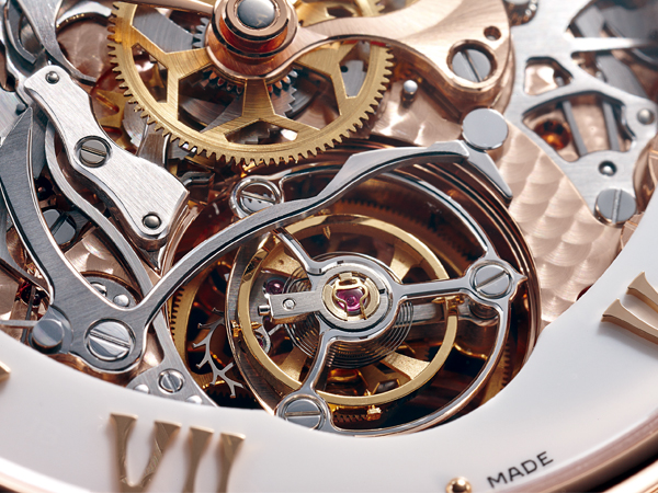 這枚機芯採用自動上鍊結構;面盤側是開面設計,只剩下繪有時標的大明火琺瑯外圈,絕大多數的機芯結構都顯露在外,飛行卡羅素處的機板鏤除,能看到另一側,增加視覺層次與立體感,機板及橋板都額外加上金雕,自動盤大幅鏤雕,雕工剛強硬氣。機板是鎳銀材質鍍玫瑰金,所有鋼質零件都是拉絲及拋光處理加倒角打磨,製作品質極佳。
