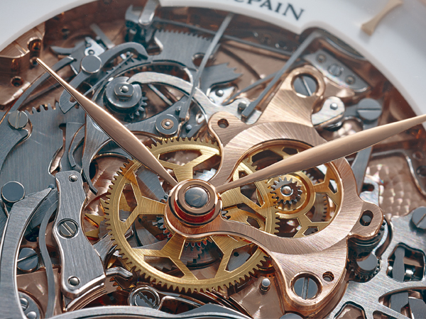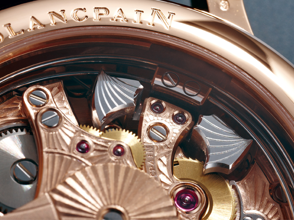 即使是BLANCPAIN,開發飛行卡羅素仍然是場硬仗。它原本的飛行陀飛輪結構與傳統陀飛輪不同,與卡羅素相似度高。但從偏心飛行陀飛輪轉往飛行卡羅素,還是必須重新設計整組擒縱結構,另外再從三番車後加上一組中間輪系,帶動卡羅素轉盤,工程更加複雜。擒縱結構裡採用無卡度游絲配精密可調轉矩擺輪,調整校時可節省一些時間,精確度也會更高。