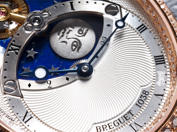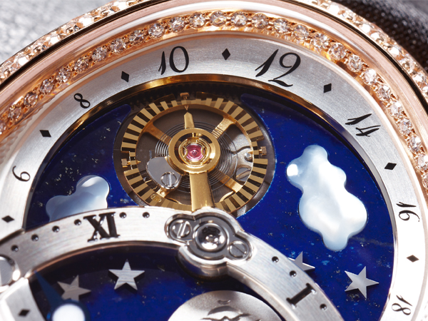 鵝蛋般的面盤分成上下兩部份,上半部是追逐不休的日與月,下半部則是充滿古典情調的時分指針;太陽及月亮亦步亦趨,彷彿巴洛克風格的小步舞曲般圓轉舞動,裙裾劃過的範圍是青金石打造的天空,雲朵由白色的珍珠母貝假扮,18K玫瑰金材質的星星閃爍動人,手工雕刻的鈦合金月亮似笑非笑;太陽意象則是機械錶的靈魂,像心臟一般搏動的擺輪。最外圈有著24小時的時標,以寶璣體阿拉伯數字呈現。
