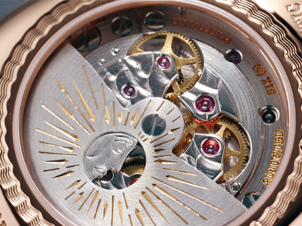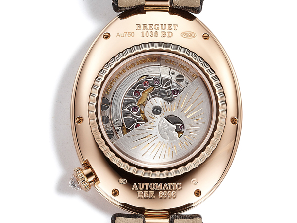 錶殼本體以18K玫瑰金打造,獨特錶耳一向是Reine de Naples最鮮明的標記,上方是隱匿式設計,下方則是一顆圓珠,跟任何女錶相比都顯得楚楚動人。底蓋是圓形視窗設計,透過視窗可以看到完整的機芯,但因為它的擺輪就在正面,因此底蓋側只限於讓人讚嘆無懈可擊的做工,看不到太多快速活動的零組件。