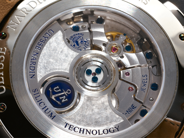 背面採透明設計,UN-334一覽無遺,絕佳的製作品質,橫跨雙側鎖定的擺輪橋板;矽質擒縱輪及擒縱叉,無卡度的矽游絲,搭配尺寸極小的螺絲精密擺輪,這顆擺輪上還有一項特點,採用非常獨特的矽質滾子台,這在其他品牌的產品裡根本是見不到的。滾子台是滾子石的基座,擒縱叉就受滾子石的推動而節制五番車,矽質滾子台理應擁有更好的能量轉換效率。