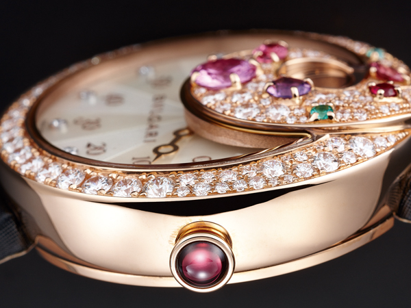 外型上就如同一個小巧可愛的果實,圓潤精巧的錶殼,12點鐘視窗為跳時小時,周圍利用祖母綠、藍寶石、紅寶石、水晶等,以漩渦方式往內集中包圍住小時視窗。面盤為珍珠母貝材質,先切割後再拼接上,令人驚訝的是每一片珍珠母貝之間絲毫沒有接縫,視覺上很像是從中央放射出光芒一般。分鐘刻度由左向右開始走時,最後走到60分鐘後,會瞬間180度逆跳回到0分,不改奢華特性,下方還放上鑽石點綴,搭配上雙圈復古指針。