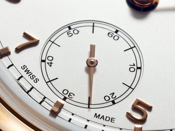 它的敲擊聲特別小,或許也可以說,特別低沈。在近代問錶裡偶而可以見到類似的設計,而且非常巧合地,絕大多數品牌都屬於同一集團,相信未來這種設計理念會有更明確的出路。IWC這款三問模組共耗費50,000小時研發,上頭安裝了「All or Nothing」保護裝置,如果滑桿沒有拉到底,就不會動作發出聲音,避免意外損害模組,它的音簧也設計在模組上,當然音高及音長都完全由手工調校,減速器也是現代化的低噪音設計。