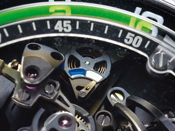 獨特的跳分分針不是隨時處於跳動的狀態,絕大多數時間它處於滑行狀態,但到液壓系統的貯液槽附近,亦即靠近30分鐘處,它會直接跳一大格,避開貯液槽,這很明顯必然來自Papi的創意,相信大家對他創作的神秘逆行陀飛輪錶記憶猶新。