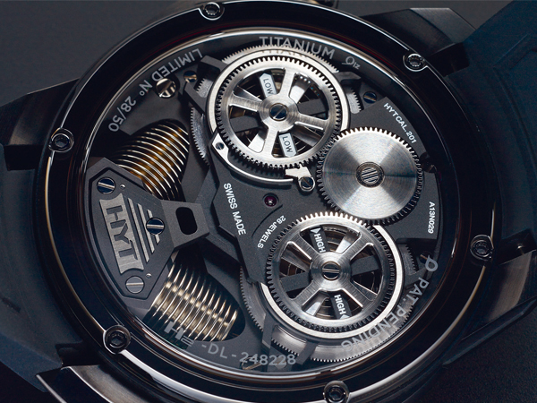 新款上的機芯經過重新設計,編號為HYT 201,嚴格來說,除了使用相同的液壓顯示機構及動力來源外,橋板位置做了大幅更動,完全是一枚不同的機芯。風箱狀的貯液槽改成V型排列,看來更具動感;原本正面看不見的振盪結構移到十二點鐘方向,以黑色拱型橋板固定,它直接把H2上兩項最重要的結構放置在最醒目的位置。