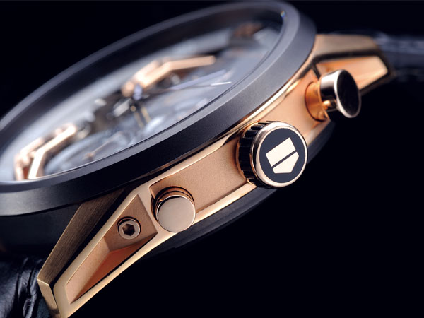 雙陀飛輪難歸難,如今倒也不是絕無僅有,而且這款的兩個陀飛輪還不用彼此協調,然而它的厲害之處在於機芯的計時陀飛輪平常是閒置靜止的,一旦啟動計時功能之後它必須即時開始作動,不容許有延遲、加速的情形,這才能達到計時碼錶的功能,然而即便是一般的擒縱器要從靜止狀態再啟動都未必能很順暢了,更何況是扭力需求極大的陀飛輪、而且還是迴轉週期5秒鐘的超高速陀飛輪?豪雅在這裡展現出對扭力控制的精準度絕對是這款的一大技術重點。