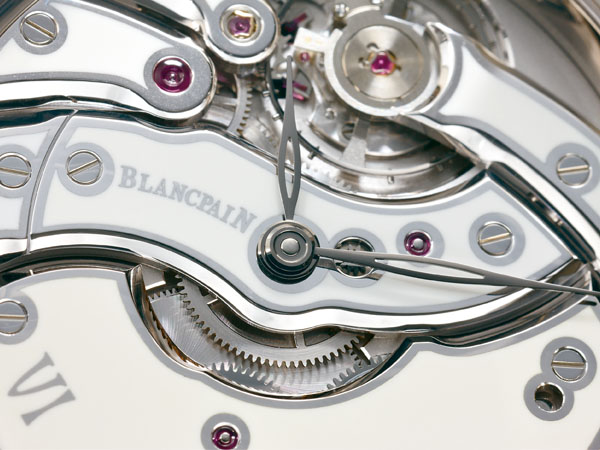 一般陶瓷都必須經過燒製的過程,但科技進步下,目前已經有免經窯燒的液態陶瓷工法;這正是寶鉑所使用的技法,橋板在雕刻時留下了BLANCPAIN字樣陽文;在發條橋板上則留下了羅馬數字時標,每個螺絲孔旁也都預留了金屬部份,避免陶瓷與螺絲接觸而碎裂。液態陶瓷的工法精髓,在於它不經窯燒過程,而是化學式的成形,將液態陶瓷原料填入凹槽後,經一段時間就會固化,性質與高溫陶瓷無異,擁有耐高溫、酸蝕等特性。