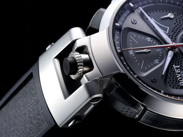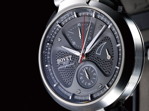 這款Sergio是由義大利設計工作室Pininfarina設計,整體風格有著播威比較少見的現代感,細部設計則是加入了與法拉利跑車元素和Sergio的特徵,像是錶面上幾個子面盤凹陷的方式,就是Sergio車背、車頭都有用上的語彙,左右兩邊的圓孔也是,除此之外上方的30分鐘計時盤更是十足儀表板的意象,非元的形狀尤其別緻。