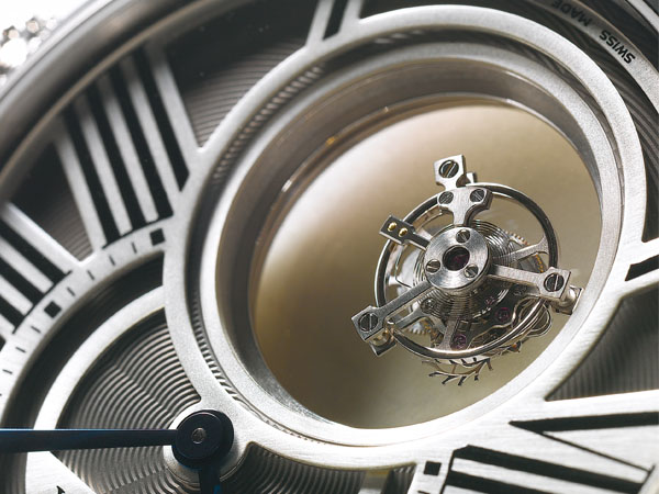 它的奧秘在於以藍寶石水晶取代橋板及四番車,面盤側用一塊厚度0.5mm的藍寶石水晶挖出孔洞固定陀飛輪,這片藍寶石水晶就是每五分鐘自旋一週,下方第二片藍寶石水晶玻璃,用來連結陀飛輪軸心與機芯,也就等同於傳統上的四番車。
