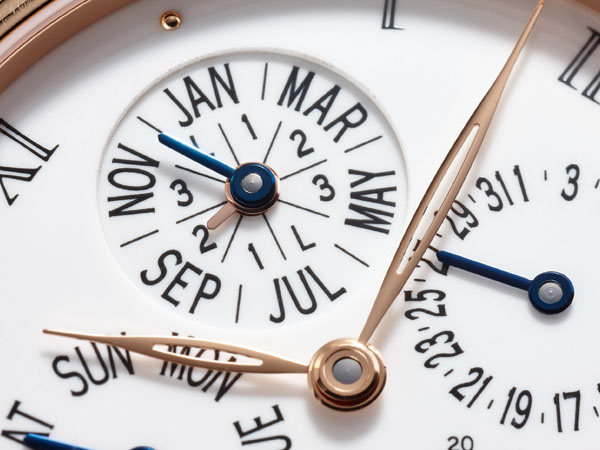 十二點的時標特別與眾不同,是一枚鑲嵌的金質圓點,不像其他時標用釉料繪製,如果沒有這個鑲貼時標,很容易就讓人忽略大明火琺瑯面盤的殊異之處。因為錶殼尺寸放大到42mm,面盤上的各種曆象鋪陳看起來較為輕鬆自在,萬年曆錶因為顯示資訊多,本來就不容易讀取,相形之下大面盤就佔優勢。它的指針配色也很好,時分秒及閏年指針與錶殼同色,其餘曆象指針則是藍鋼處理。當然,從指針的切面上,也能看出它的不凡身價。