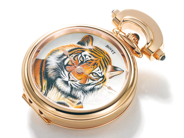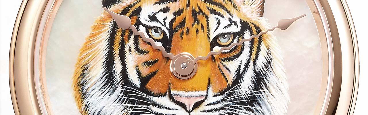 纖薄而脆的珍珠母貝材質先製成面盤胎板,再以工筆彩繪吊晴白額虎,主要色彩是橘、黑、白三色,雖然看來虎眼生威,但整張臉卻頗有福態,頗能令人懷想民初知名畫家張善孖(張大千的哥哥)手繪猛虎,張公愛虎成痴,甚至養有一小虎,每日與虎同眠,知名的美國援華空軍「飛虎隊」其名,即來自張公贈陳納德將軍的「飛虎圖」。