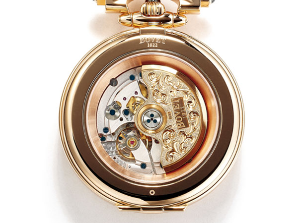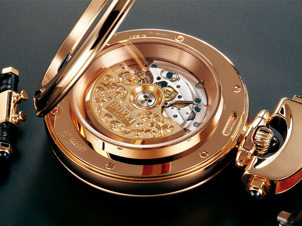 在強大的自製機芯能力支援下,播威現代市場定位極度鮮明,所有產品集中在幾個面相:頂級複雜功能、奢華珠寶鑲嵌、以及傳統裝飾技藝。此錶屬於Amadeo Fleurier系列,除了做工精美絕倫、可當做手錶、懷錶及座鐘三種不同用途的Amadeo變形錶殼,還有著銀鉤玉唾的彩繪珍珠母貝面盤。