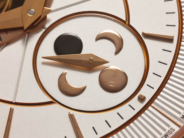 精密月相與傳統月相差異只在傳動比,用上一枚特別大的齒車,擁有多達135齒的月相輪就能讓精確度由數年誤差一天、提高到122年才有同樣的誤差,錶殼九點鐘方向特別加上的隱藏式校正鈕,就用來調校月相。