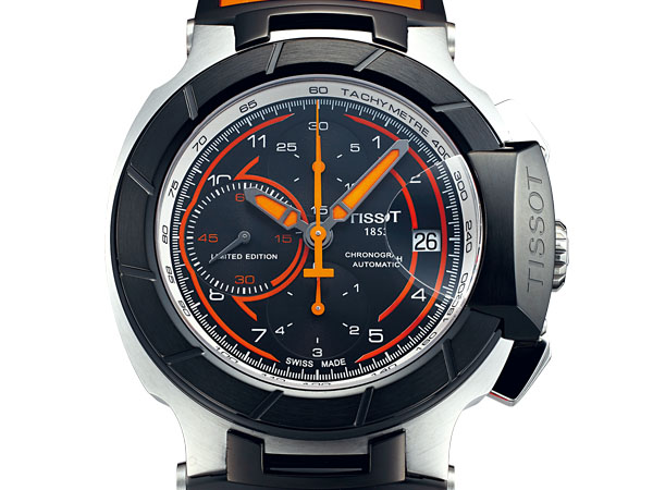 年度限量款常有幾個重點:大尺寸錶殼、錶冠的造型突出、擁有重型摩托車煞車碟盤的錶圈、色彩的變化,還有近來常見的碳纖維面盤,以今年的限量款來看,採用不鏽鋼材質、直徑45.3mm的大錶殼都一樣,並在錶圈及連結到錶冠的部分採用黑色PVD處理,也鐫刻TISSOT的品牌名,不過本款的錶圈上取消了數字刻度,看來更為簡潔。