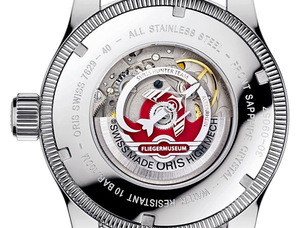 而這只腕錶的另一個重點是錶背,透明底蓋印著Swiss Hunter Team的官方圖騰,搭配運轉的招牌紅色自動盤,讓飛機圖案增加動感的元素。