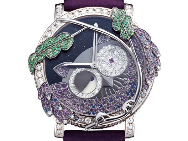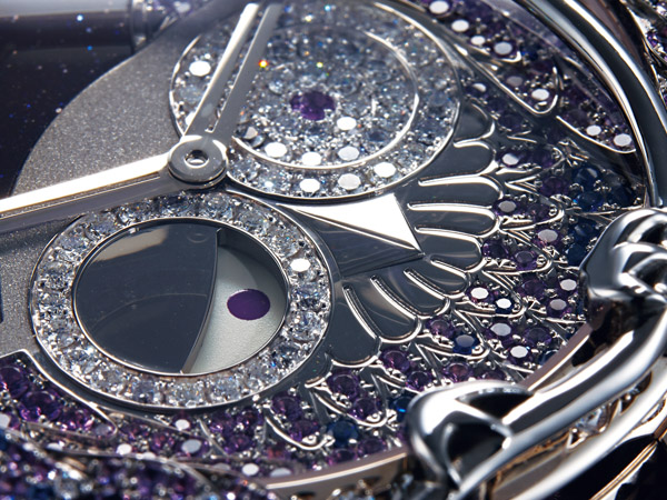 仔細觀察在指針軸心的下方,貓頭鷹其中一隻眼睛半閉,但其紫色眼珠卻不斷轉動代表小秒顯示,顯現俏皮的動態。在錶款的外觀部分,也不是循規蹈矩的模樣,貓頭鷹斜倚在枝葉上,圖案從面盤一直延伸到錶圈外,立體的金雕枝葉、貓頭鷹的爪子及部分羽翼也顯得很逼真,同時貓頭鷹也以鑽石、剛玉及沙弗萊石點綴,紫色的身軀共鑲嵌了378顆剛玉和沙弗萊石,總重約3.3克拉。
