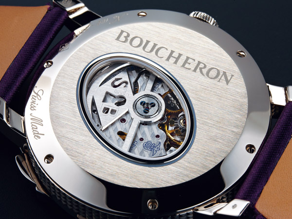 錶款的錶圈與錶耳也都鑲嵌美鑽外,錶殼外側還有立體的巴黎釘紋,錶款整體看來力量飽滿,也兼具奢華的美感。此外寶詩龍也在珠寶和製錶間有良好的平衡,搭載GP 4000自動上鍊,並在底蓋設計一個特殊的橢圓形藍寶石水晶玻璃視窗,可欣賞到鏤空的自動盤作動。