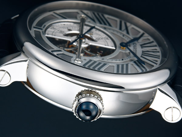 它的面盤是獨特的複式結構製作,中央部份鏤空露出擺輪及秒針盤等擒縱結構,現代風的羅馬數字時標偏重在面盤上半部,下半部皆以棒狀時標取代,偏心式時、分指示為秒針及重錘結構留下寬闊的舞台,時標事實上是浮在面盤主體上的一整片結構,其下的背景則是扭繩紋處理,雙層面盤結構散發出厚重而新潮的質感,與Rontode外型相呼應,作工精緻。錶冠造型有畫龍點睛的效果,造型頗似船舶用的舵輪,一如大多數的卡地亞錶,上鑲有藍色石頭。