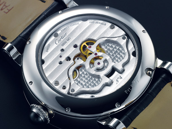 透過藍寶石水晶底蓋, 能夠看到9800MC上典型的卡地亞複雜時計風格,日內瓦波紋裝飾的橋板,魚鱗紋處理的主機板,偏下方還能見到品牌商標型式的橋板,它顯然也可以製作成更實用或基於功能而存在的造型,但為了突顯卡地亞的特色,因此採用了相同的視覺元素,先前所有卡地亞複雜機芯都會使用的鏤空橋板。商標型橋板負責蓋住三台齒車及重錘擒縱結構的主軸,看似整枚機芯裡最重要的部份;以這款錶的設計來看,這個部份的確是其他品牌沒有製作過的結構,但其他部份的設計及製作也要頂級廠才能夠辦到。