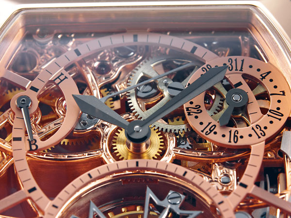 Cal.1790除了基本指示外還多出日期針及儲能指示,因此鏤雕後看來不像只有時分基本款那麼井然有序,某種程度來說甚至會令人懷疑鏤除得不夠通透;它屬於標準的三板式構造,發條盒有一塊橋板、走時輪系一塊,擒縱結構與擺輪一塊,只要是陀飛輪機芯就經常能看到這種配置。