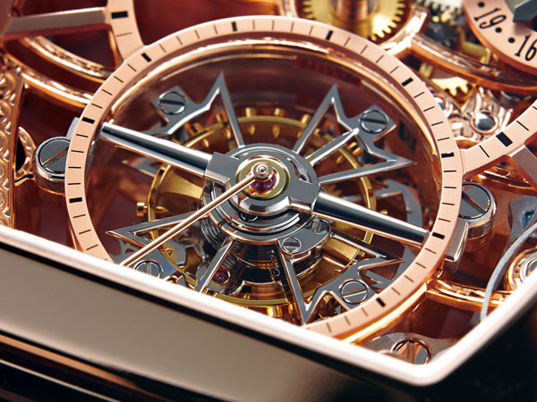 它是新研發的機芯,但看來傳統,撥針輪系齒車在設計時沒有特意隱藏、也不特別強調,應是秉持著中庸的念頭製作,時間指示不在機芯正中,因此分鐘刻度環只包括略小於三分之二的區域,陀飛輪佔據相當面積。傳統陀飛輪橋板打磨非常細緻,雖然結構不如飛行陀飛輪創新,但在基本功上是一時之選。