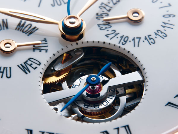 在面盤十點鐘方向也有一項全球首創設計,它是指針式逆跳月相,相信是為了保持萬年曆錶仍舊擁有月相而設計,它等於在錶上多加上一項逆跳式的複雜功能,但它實在不易得到認同,當其他月相都能夠次第變換月亮的形狀之時,它只能顯示出朔、下弦、望及上弦,存在感非常薄弱,無論如何,它保持一款精彩的萬年曆錶上仍有月相顯示。