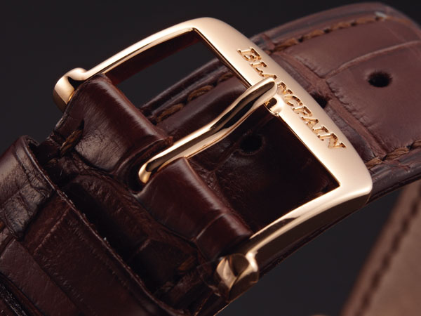 寶鉑為這款錶配上了完全符合它尊貴身份的錶殼和面盤,錶殼由18K玫瑰金打造,它也不是一般的殼,常見的校正按鈕換成了寶鉑特有的隱藏式校正按把,分別配置在四個錶耳下方,看起來錶殼更有整體感;雖然萬年曆錶上沒有校正按鈕,看來會有一股難言的失落感,但知道它有著別人沒有的隱藏校正按把,應該會有更高的滿足感才對。