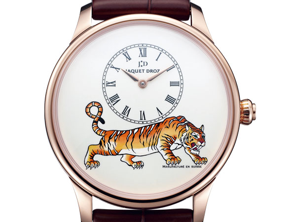 Petite Heure Minute是雅克羅德經典的二針款,偏心顯示的時分針指示相對簡潔,極大的錶徑,彌補了偏心顯示經常遇到看起來不夠大氣的窘境。加上以虎為主題的畫琺瑯工法,讓這款錶的面盤免去了頭重腳輕的危險。