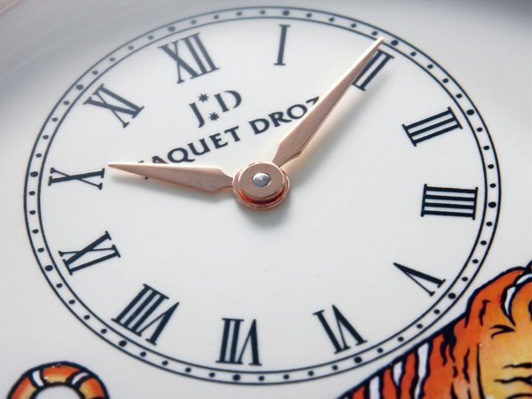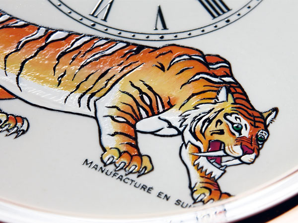 這款錶上的大蟲有著獠牙,主要的顏色當然就是黃白黑三色,漸層的色彩製作略費心思,除了老虎圖案之外,時標以及分鐘軌道也都由琺瑯繪製,應屬最傳統的日內瓦傳統琺瑯技法,這部份只要單色繪製,不需額外加色,雖然簡單,但時標要求就是一個工整,好與不好正是基本功紮實與否的成績單。