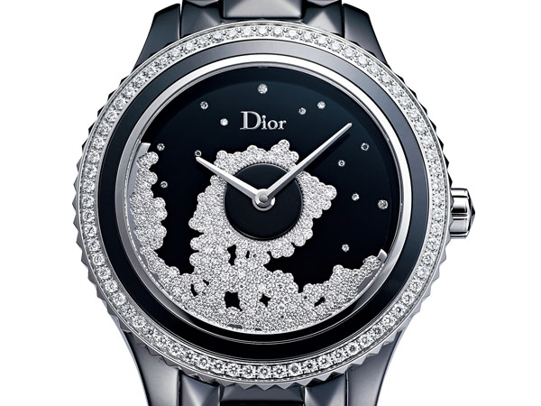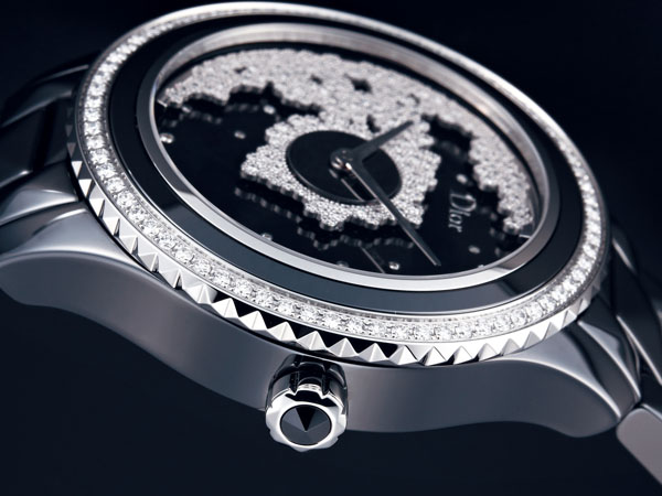 Dior VIII採用不鏽鋼材質結合黑色高精密陶瓷,在黑色陶瓷錶圈上以美鑽點綴之外,鋸齒狀的錶圈及鑲嵌錐狀陶瓷的錶冠也增加了視覺層次。