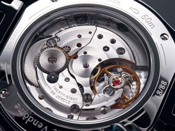 由DIOR聯合Soprod機芯廠及Frédéric Jouvenot合作,研發出將自動盤置於面盤上的Calibre Dior Inversé機芯,因此錶背可見螺絲微調擺輪外,也可清楚看到大鋼輪與發條盒。