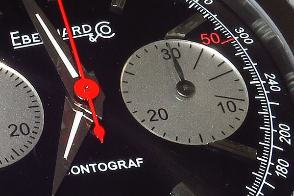 在30分鐘計時針盤右上方,有一個紅色的50標示,從50數字的右側可以見到一條紅色刻度,這剛好和第12分鐘的刻度相同。為什麼在這裡寫上50呢?這其實是面盤外圍測速刻度的延伸,一般的測速刻度只有一圈(紅色的計時秒針繞一圈),最低只能測到時速60公里(或其他單位)的速度,而這款腕錶的測速刻度則在計時秒針繞了一圈後,向下延伸到12秒的位置,因此能測到最低50公里的時速。