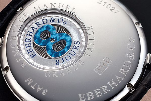 八日鍊機芯需要超長的發條來儲存動力,這對於空間有限的懷錶、腕錶來說是很大的挑戰,因此直到1889年才有首款八日鍊懷錶出現,在腕錶上的空間更小、難度更高。依百克在原來的基礎機芯上另外加了一條1.25公尺長的發條,連原來0.3公尺的發條一起算,總發條長度達到1.55公尺,動力最少有八天。從錶背可欣賞到後加的發條盒及其內的發條;發條盒鏤空成8字型,代表八日鍊,表面經過珍珠圓紋打磨修飾,並做成藍色,在適當的角度下,可以反射出迷人的藍色光澤。鏤空處理並非只有裝飾效果,如此直視發條鬆緊,也是了解動力儲存量的另種方式,而對於喜歡機械動作的朋友來說,上鍊時看著發條一步一步捲緊,充滿機械樂趣。