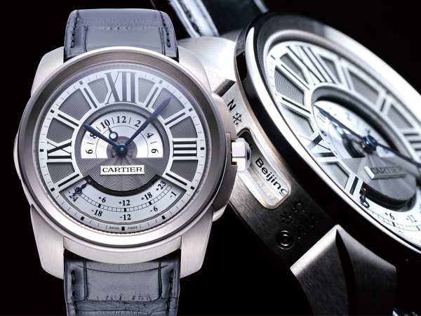 可調整夏令或冬令時間也是它的特點,這時以視窗旁代表夏天及冬天的校正鈕調整城市名稱,所得到的就是該城市夏令或冬令時間,設計思慮細密好用。它使用Calibre de Cartier直徑45mm的巨大錶殼,面盤有著卡地亞迷人魅力,以及天才洋溢的結構設計。
